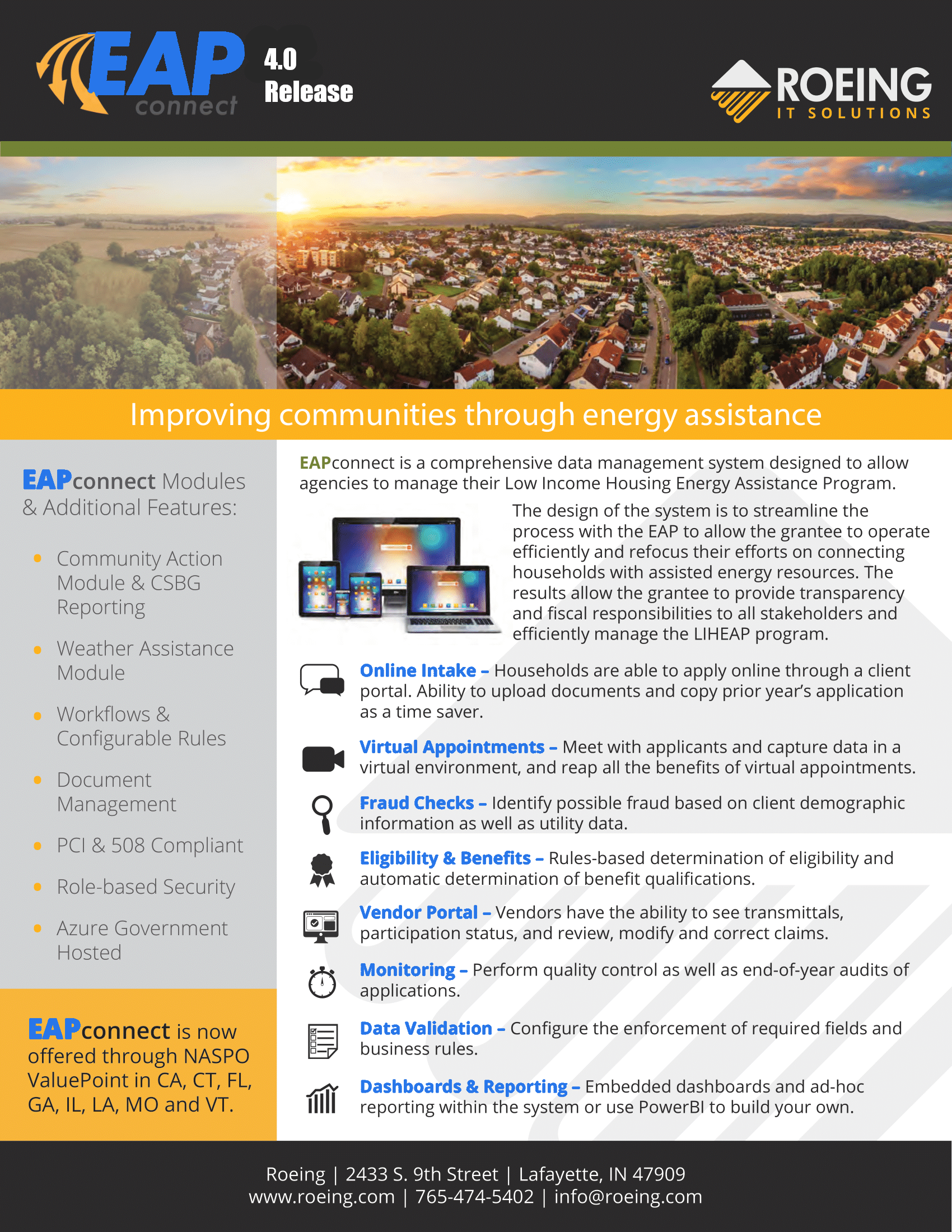 EAPconnect is a comprehensive data management system designed to allow agencies to manage their Low Income Housing Energy Assistance Program. The design of the system is to streamline the process with the EAP to allow the grantee to operate efficiently and refocus their efforts on connecting households with assisted energy resources. The results allow the grantee to provide transparency and fiscal responsibilities to all stakeholders and efficiently manage the LIHEAP program.